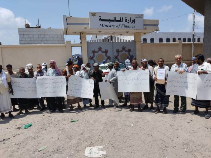 وفي ذات السياق، أقام مجلس أعضاء الموظفين بمحافظة البيضاء صباح الأحد، وقفة احتجاجية أمام بوابة وزارة المالية، بمديرية خورمكسر في عدن، شارك فيها العشرات من موظفي المحافظة والموظفين النازحين من دواوين الوزارات والسلطات المحلية بالمحافظات الأخرى، للمطالبة بصرف المرتبات المتأخرة وإنهاء معاناة الموظفين التي تفاقمت منذ انقطاع الرواتب.